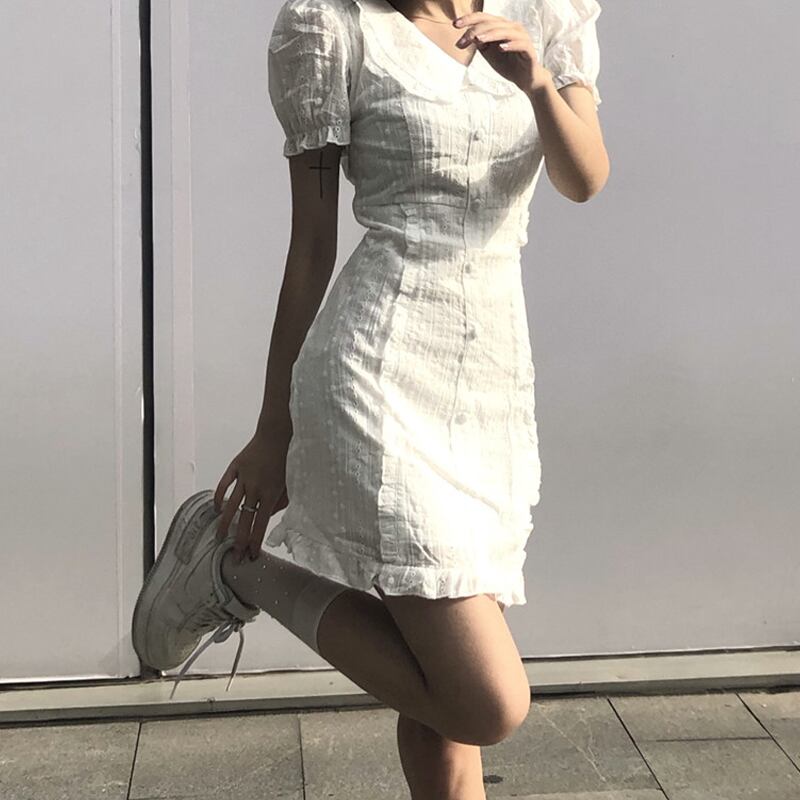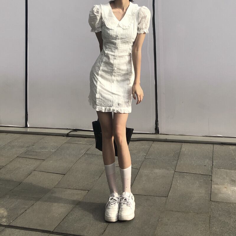カラーホワイトスリーブドレス サマースタイルショートスカート 夏物 スーパーモール35790768505