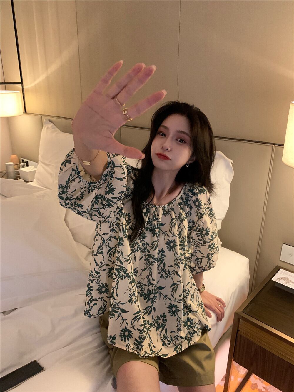 色:ワンピース花柄トップ,カーキ色のショートパンツ