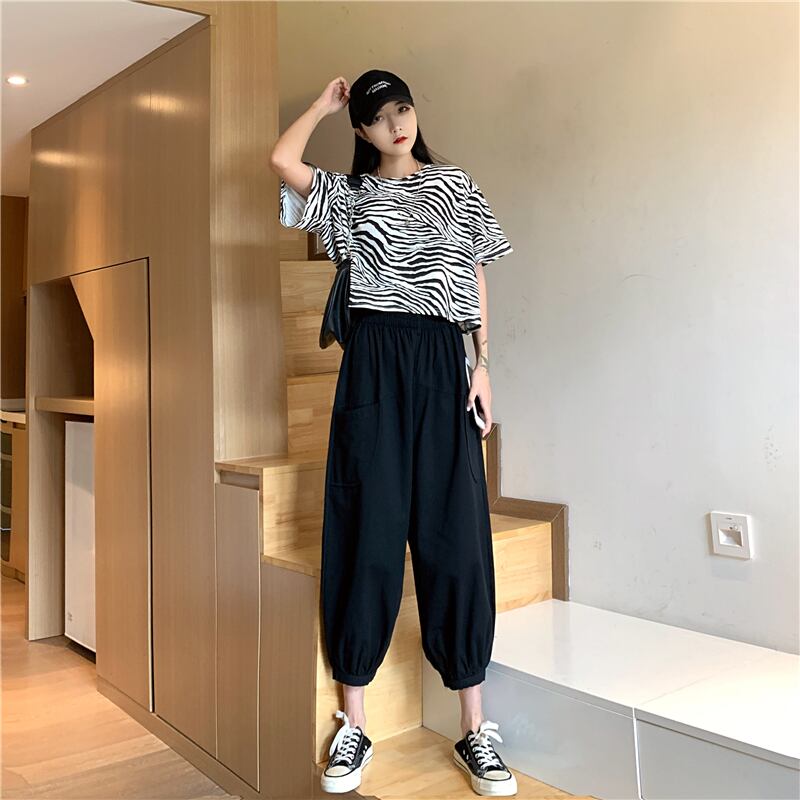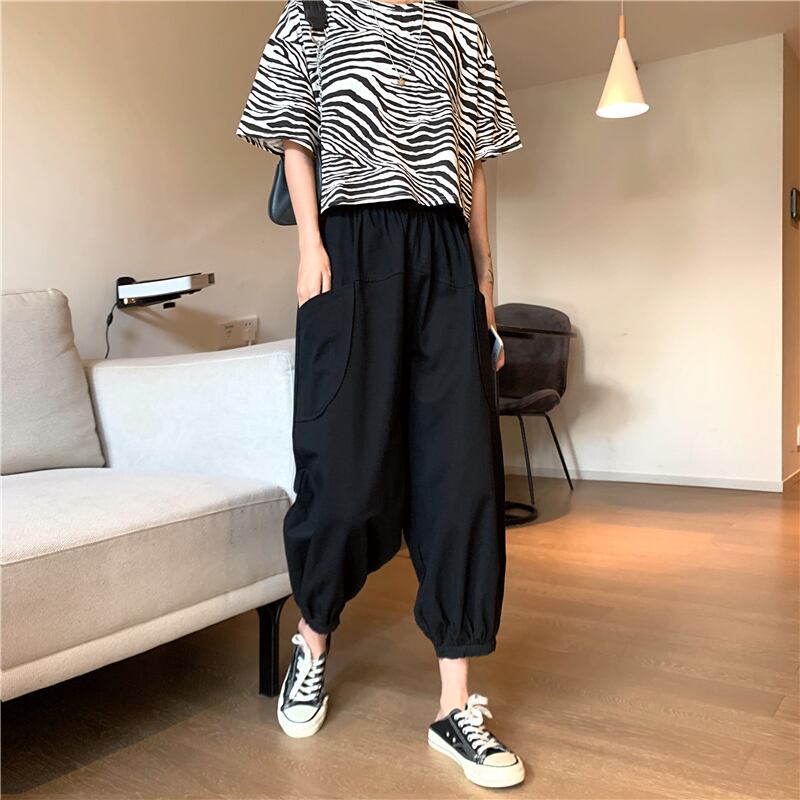 ブラッククロップドサマー薄手パンツ ウェストスリムルーズカジュアル 夏物 スーパーモール56434000858