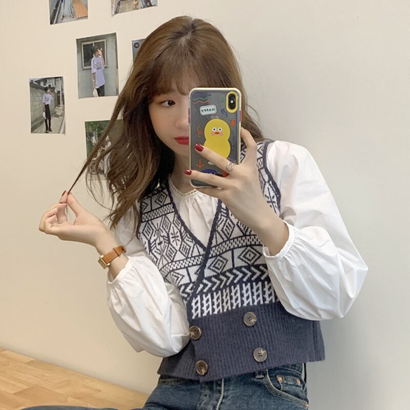 Vネックダブルブレストニットスプリングオータムルーズショート 春物 秋物 スーパーモール8952329039