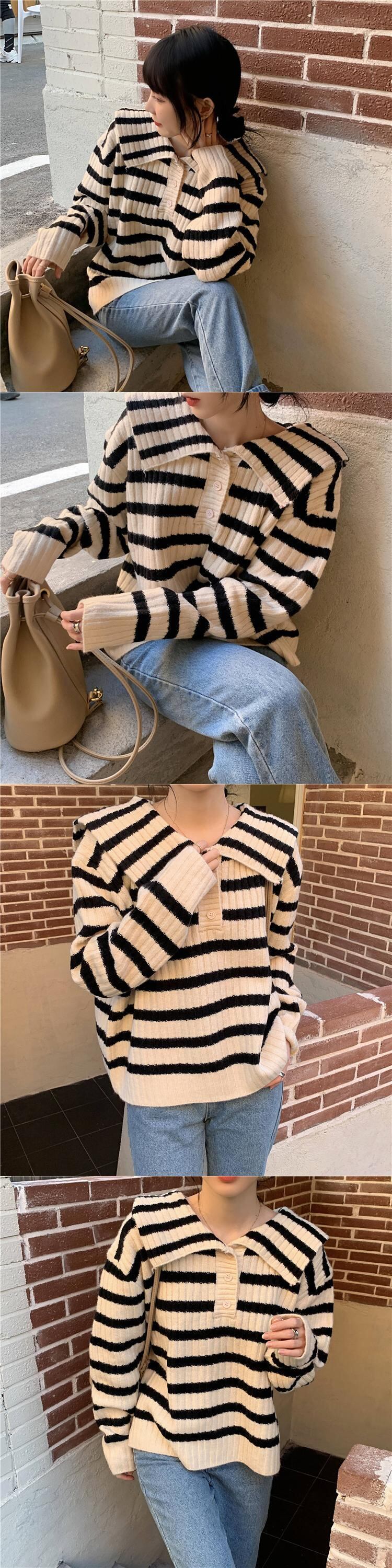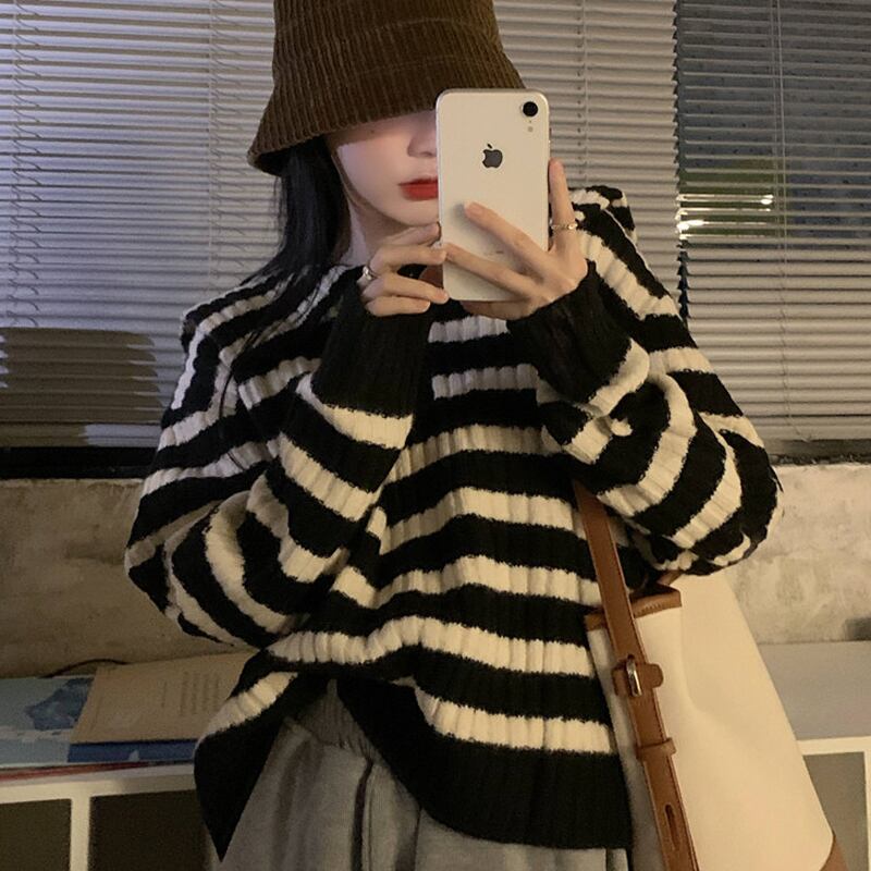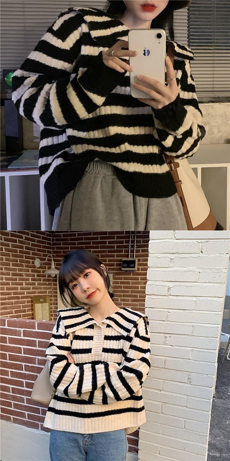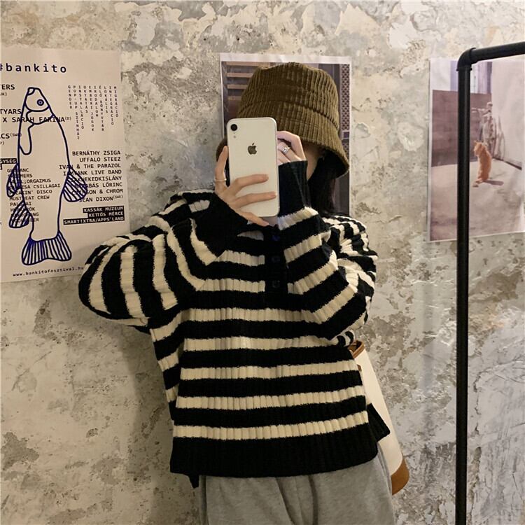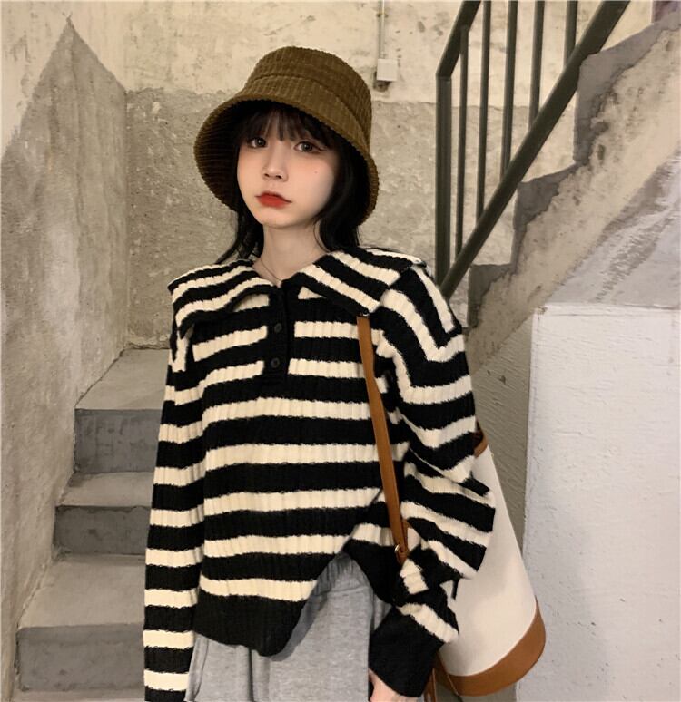 ストライプネイビーカラーセーター スプリングオータムスタイルプルオーバー ショートトップス ロング 春物 秋物 スーパーモール32932376235