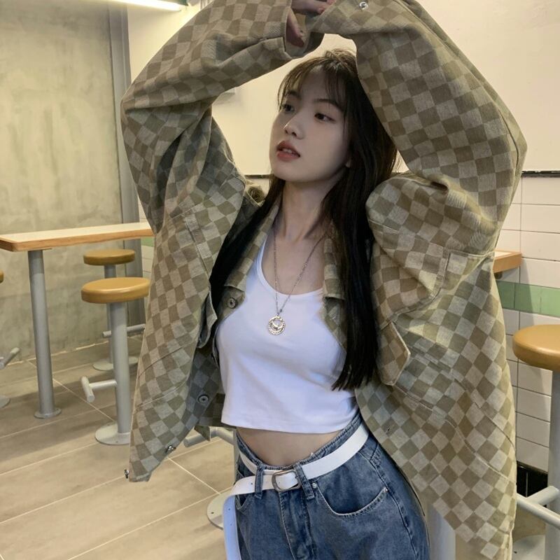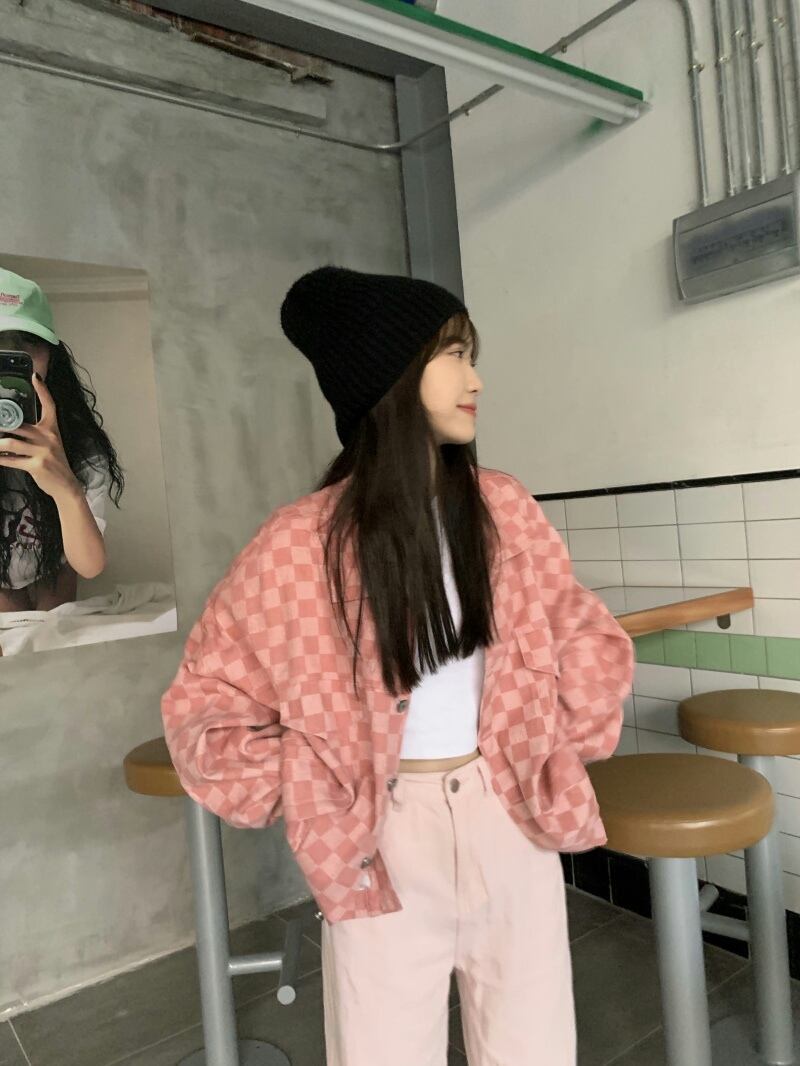 格子柄ジャケット スプリングオータムルーズトップス ピンク ストリート 春物 秋物 スーパーモール63246431311