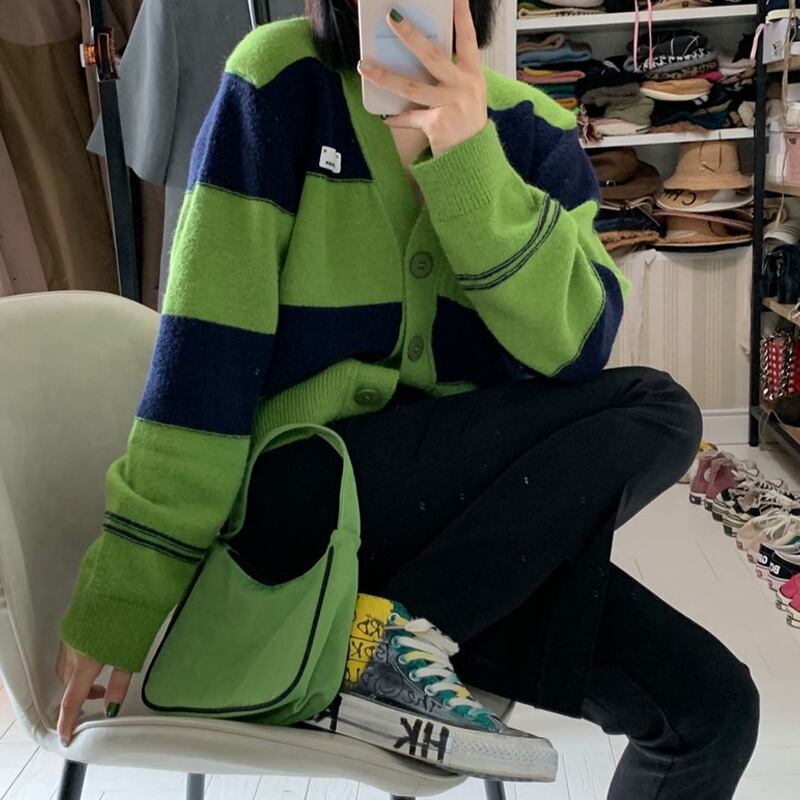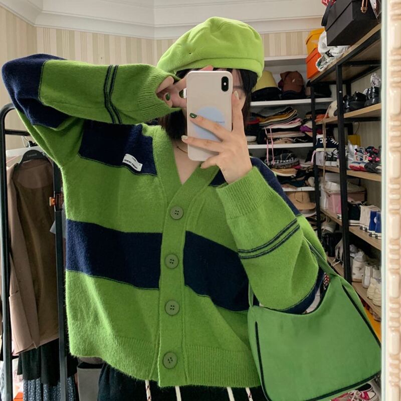 Vネックグリーンストライプセーター スプリングオータムルーズクロップドトップス ニットコート 春物 秋物 スーパーモール77710949101