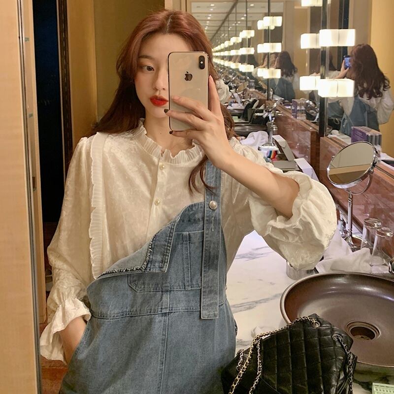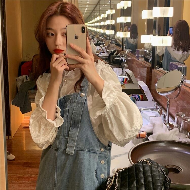 色:白いシャツのワンピース,ブルービブシングルピース