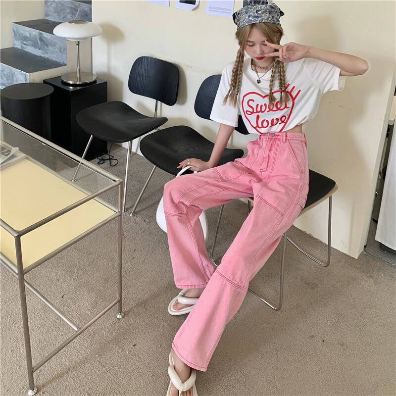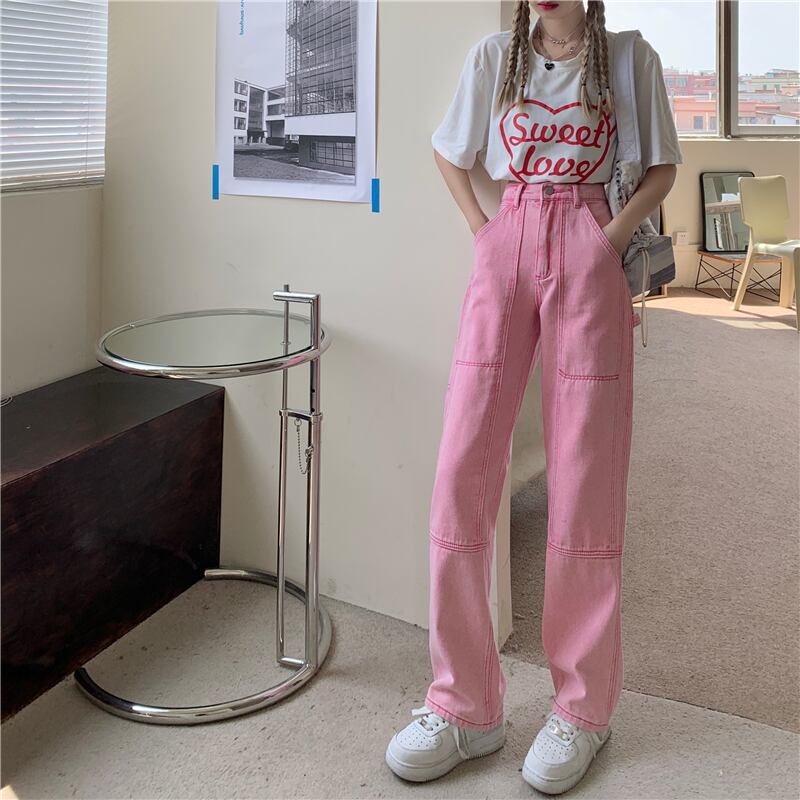 ジーンズ スプリングオータム薄手ハイウェストウェストワイドレッグパンツ ルーズ ピンク 春物 秋物 ワイドパンツ スーパーモール90285697844