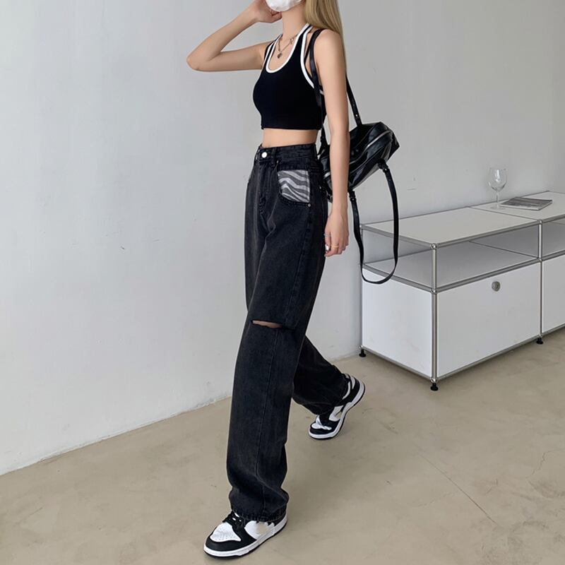 ブラックジーンズ スプリングオータム薄手ハイウェストパンツ ルーズ 春物 秋物 スーパーモール48088787783