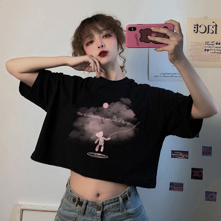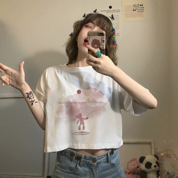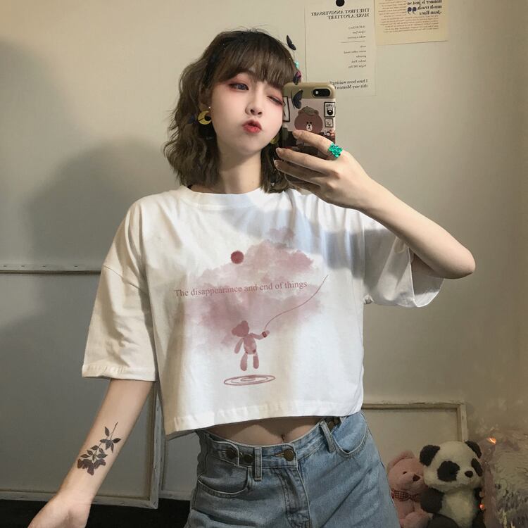 レッドプリント柄ショートTシャツ サマーホワイトルーズトップス 夏物 スーパーモール61168425956