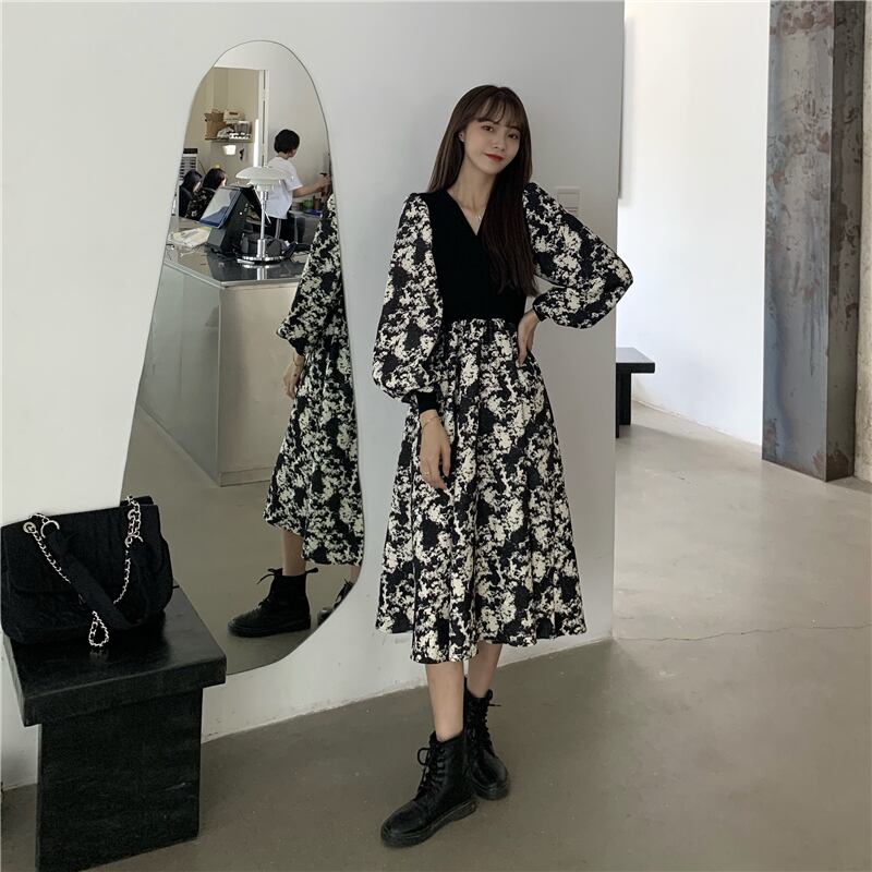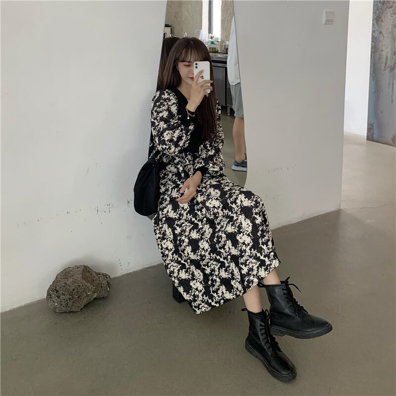 ロングVネックドレス スプリングオータムスタイルスタンダードスカート レトロ 春物 秋物 スーパーモール12315036516