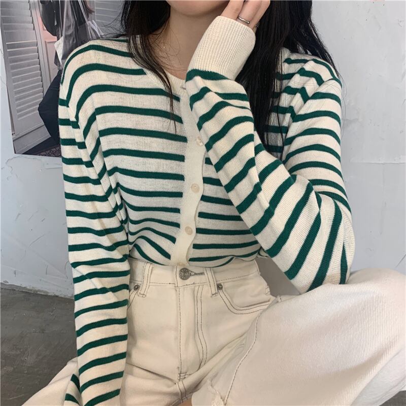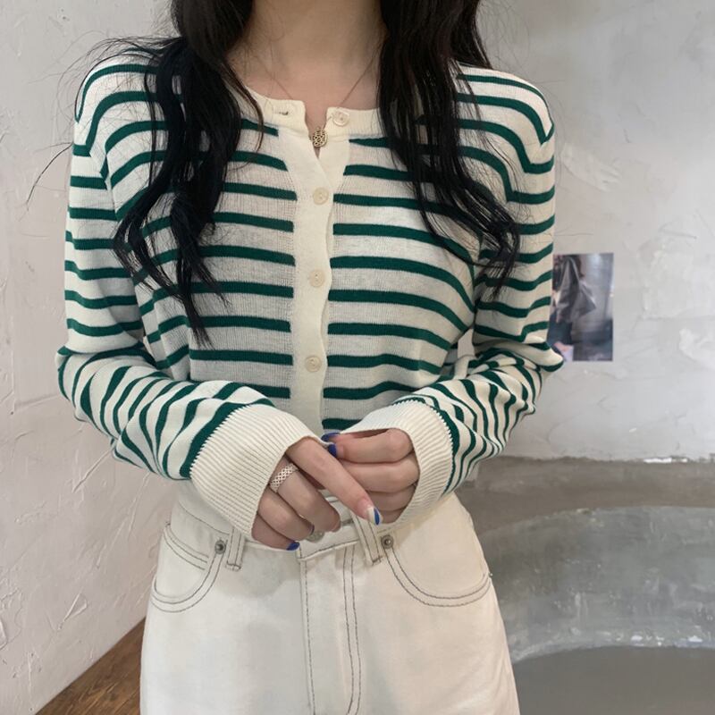 ストライプニットカーディガンスプリングオータム薄手セーター ジャケット スタイルトップス ロング 春物 秋物 スーパーモール76806868277