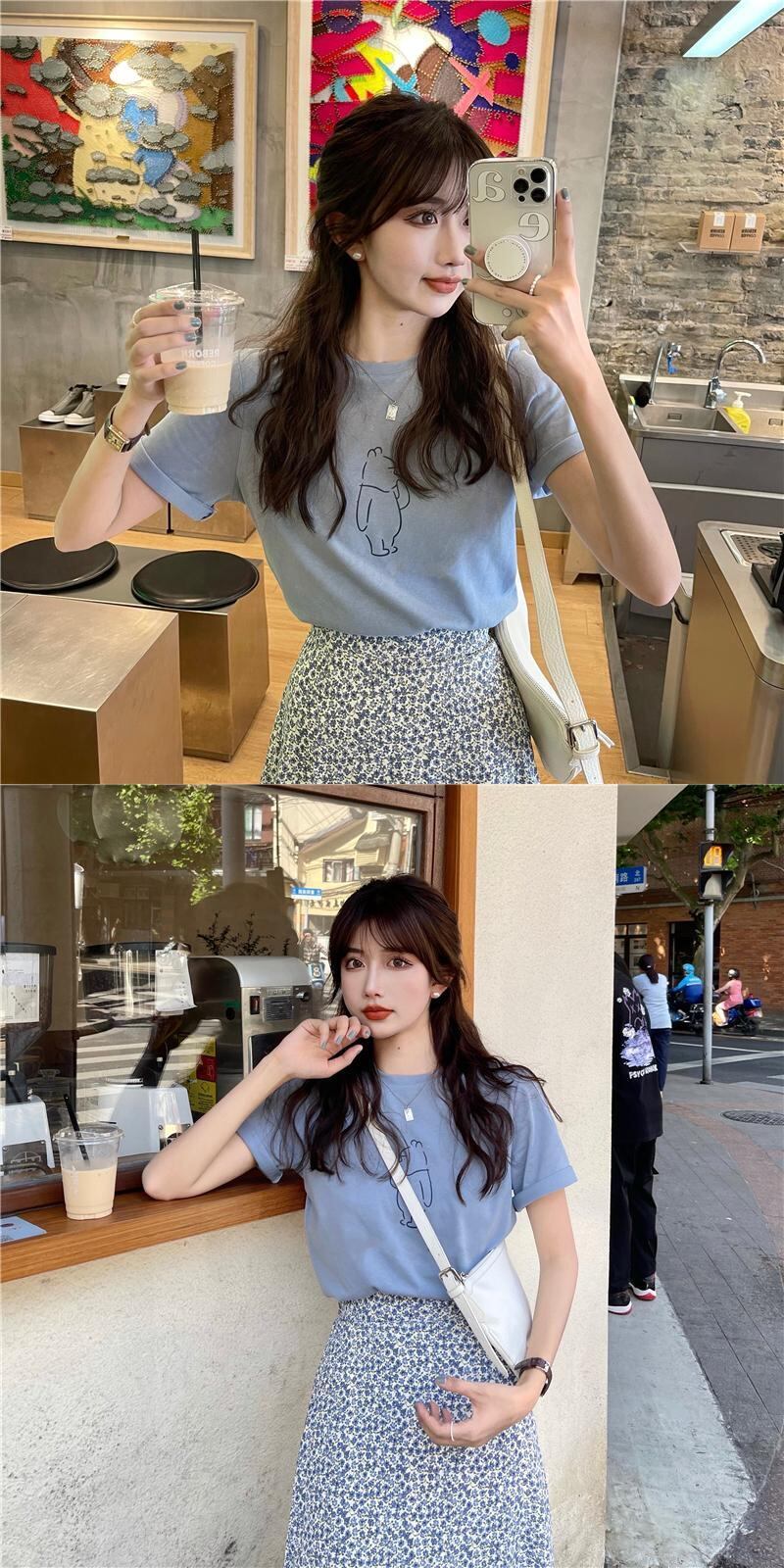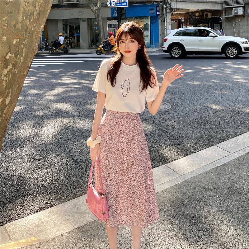 色:ブルーTシングルピース,ブルーフローラルスカートワンピース,ホワイトTシングルピース,ピンクの花柄スカートワンピース