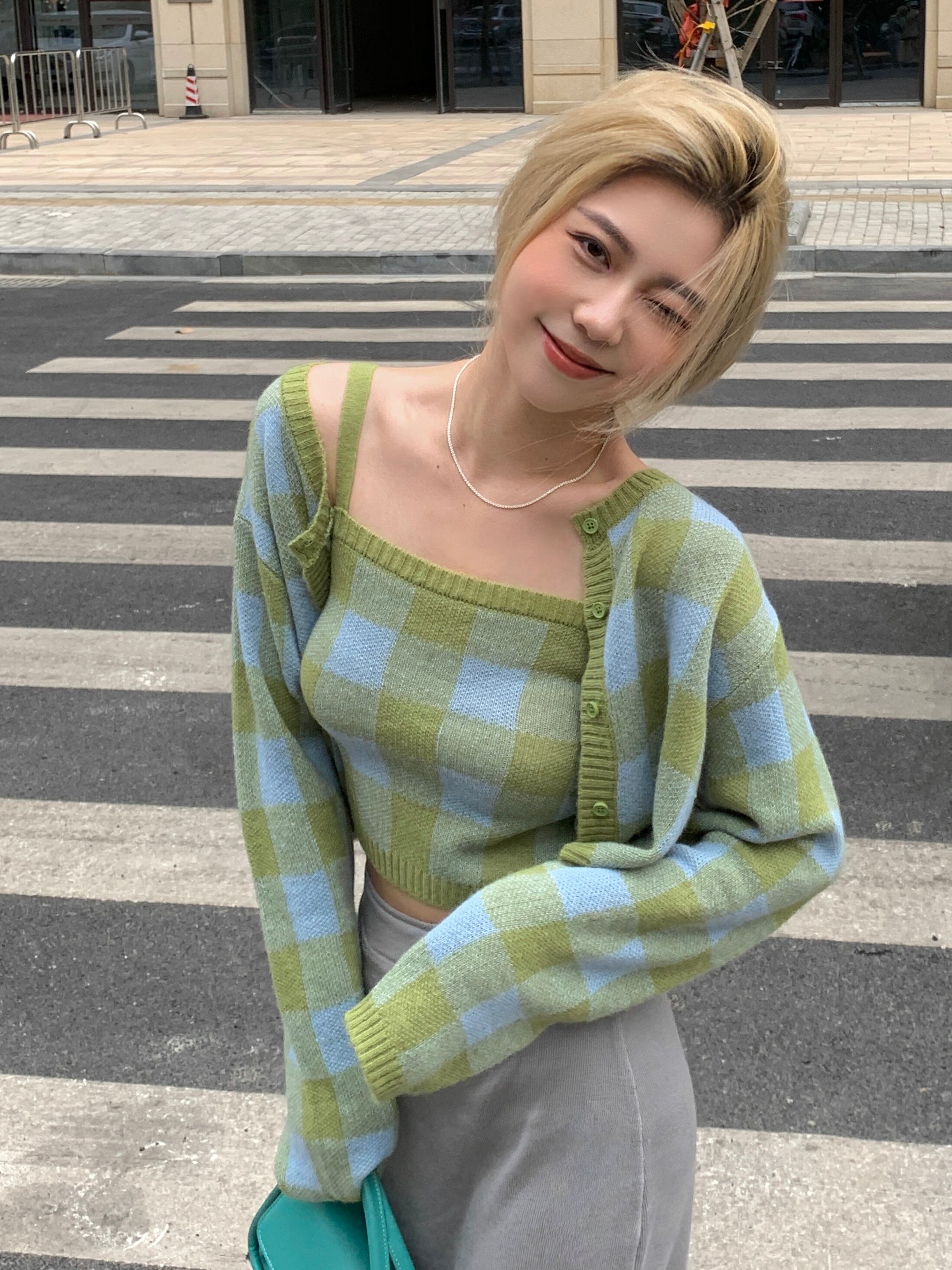 ショート格子柄セーター コート スプリングオータムスタイルニットカーディガン 大人ガーリー スウィート キュート カジュアル 春物 秋物 ピュア スーパーモール55799235783