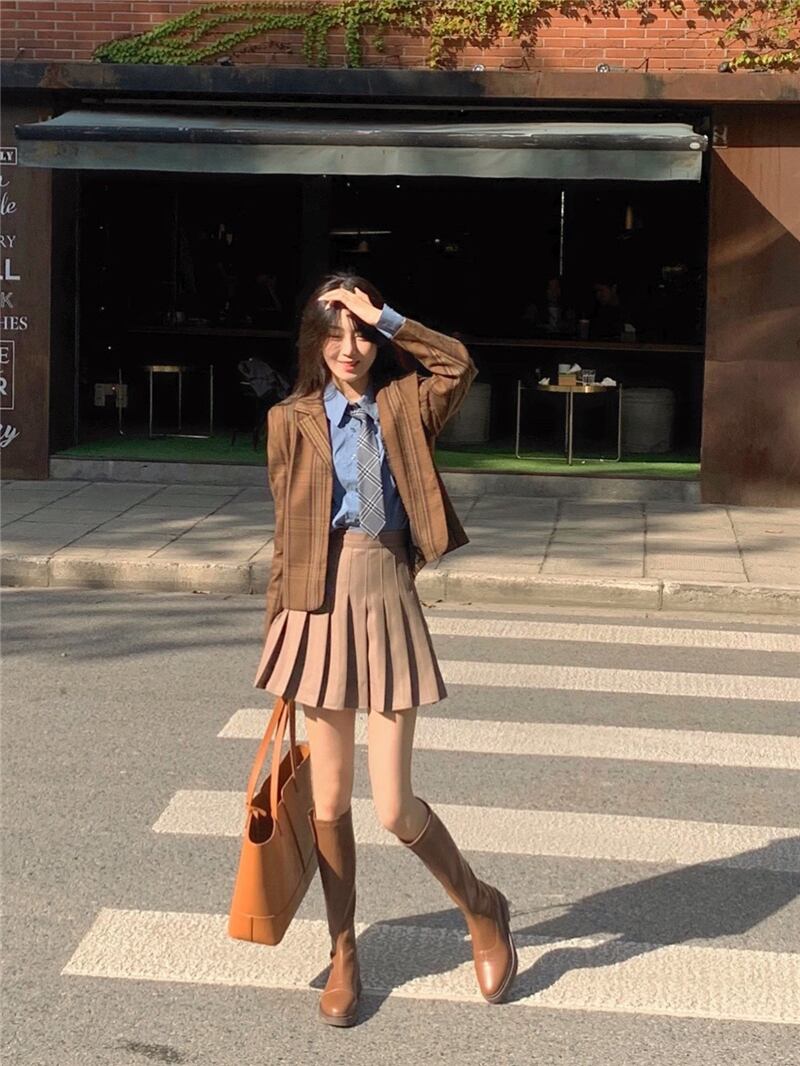 色:青いシャツ+ネクタイ,モカスカートワンピース,格子縞のスーツワンピース