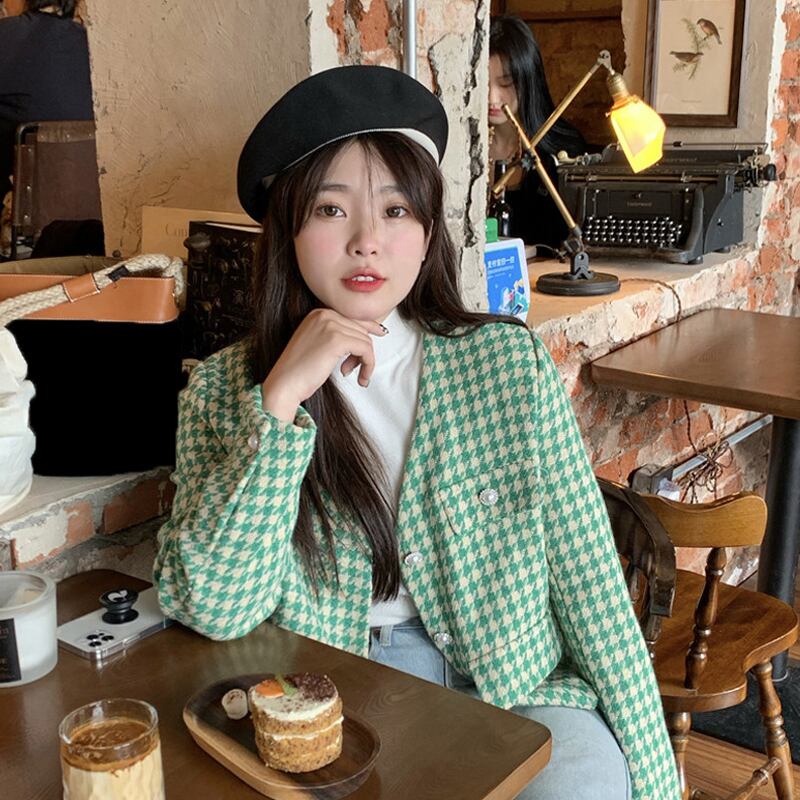 スタンダードVネックグリーンジャケット スプリングオータムルーズショート レトロ 春物 秋物 スーパーモール17076198005
