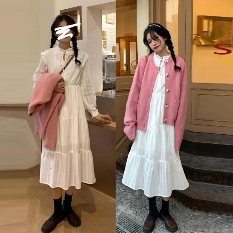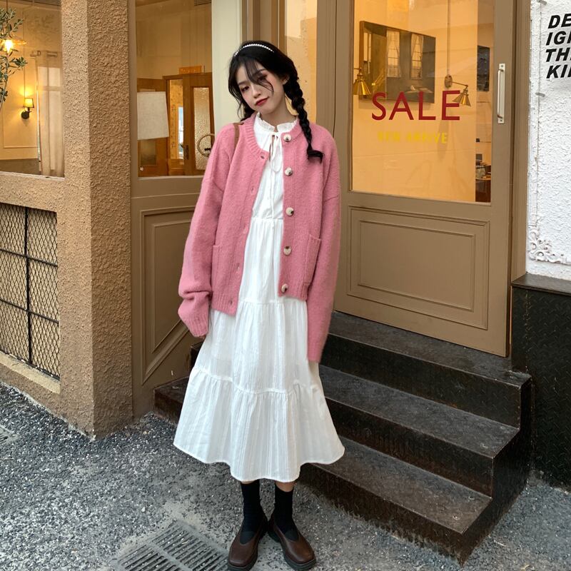 色:ピンクのニットウェアワンピース,白いワンピースのワンピース
