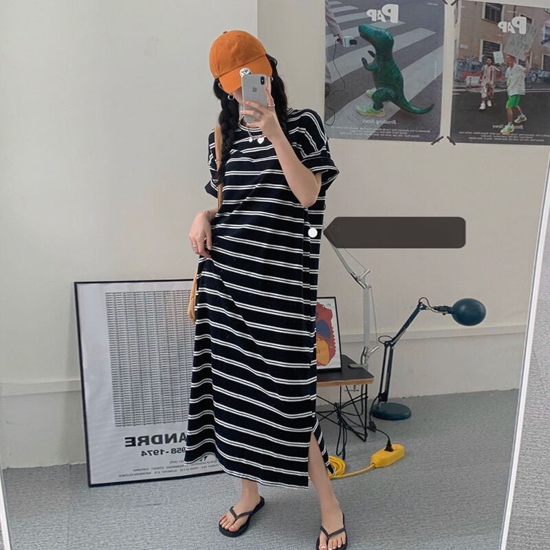 サマースタンダードドレス ストライプTシャツ スカート ロング レトロ 夏物 スーパーモール71389636561