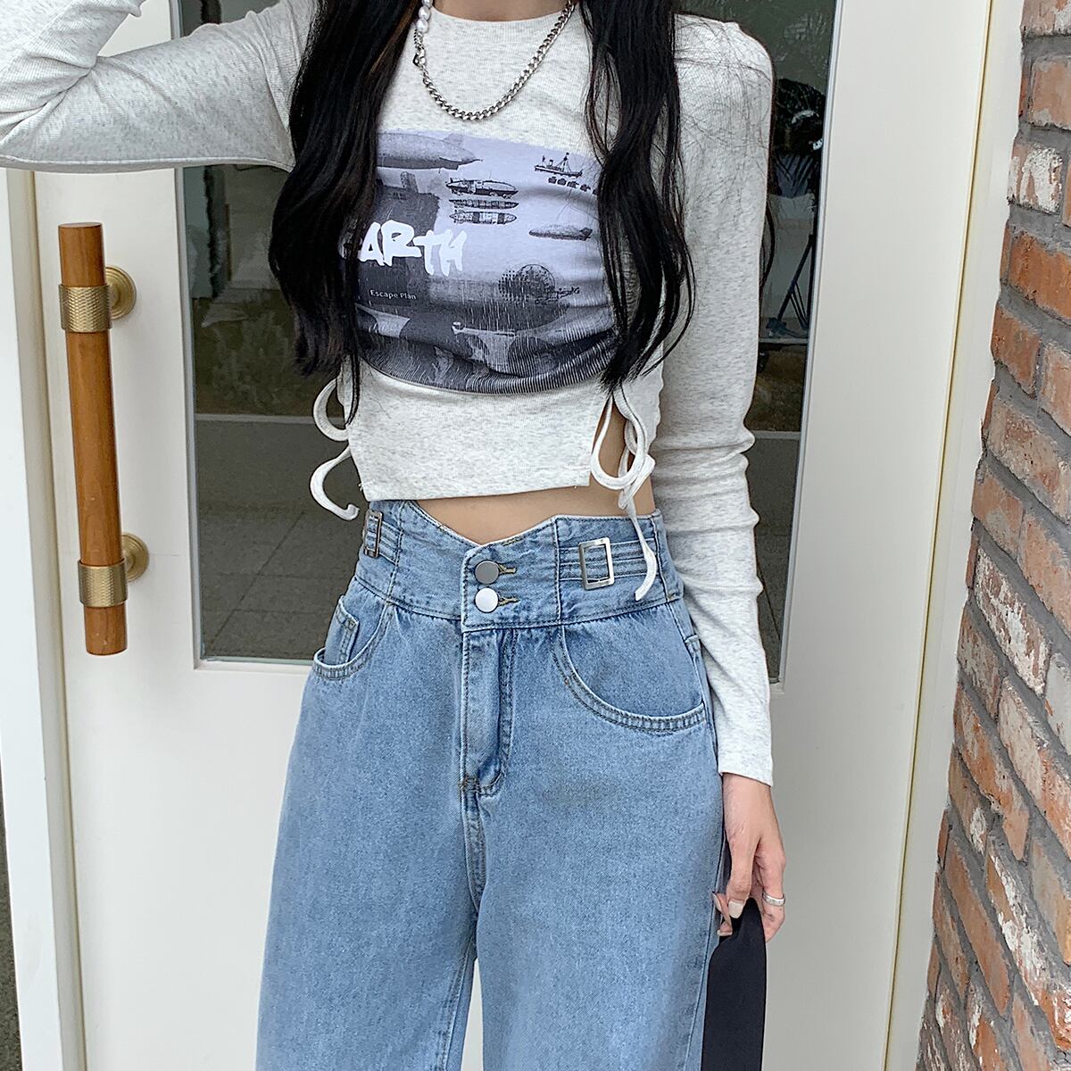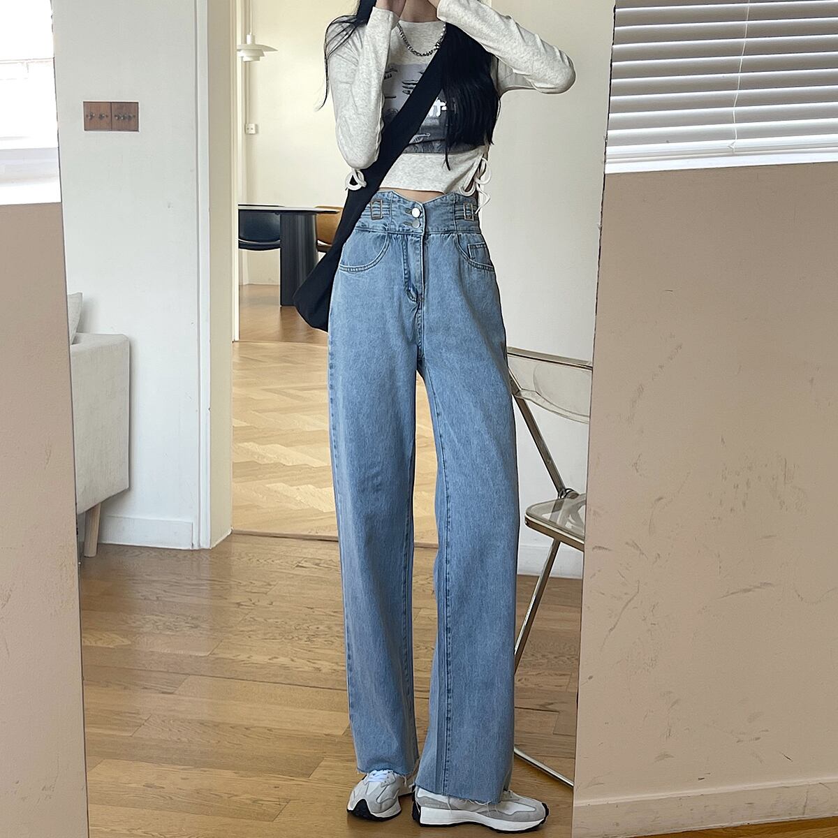 スプリングオータムハイウェストジーンズ ルーズパンツ 春物 秋物 スーパーモール61571832752