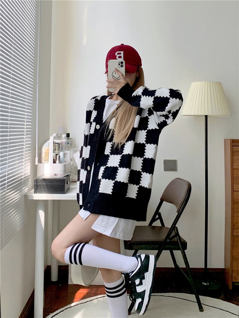 格子柄Vネック長袖スリーブニット スプリングオータムルーズカーディガンジャケット セーター ロング 春物 秋物 スーパーモール7930575970