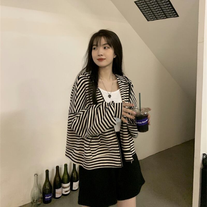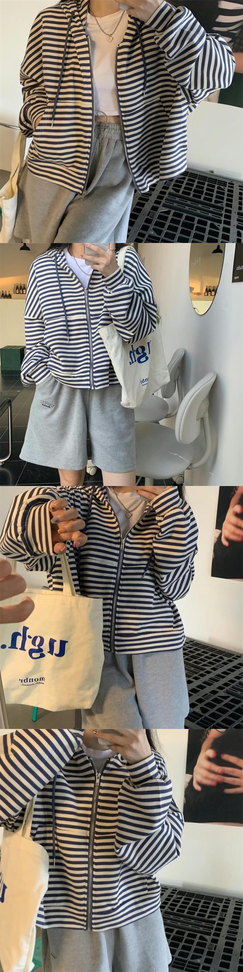 ストライプフードジャケット スプリングオータムルーズショートトップス ロング 春物 秋物 スーパーモール67745926160