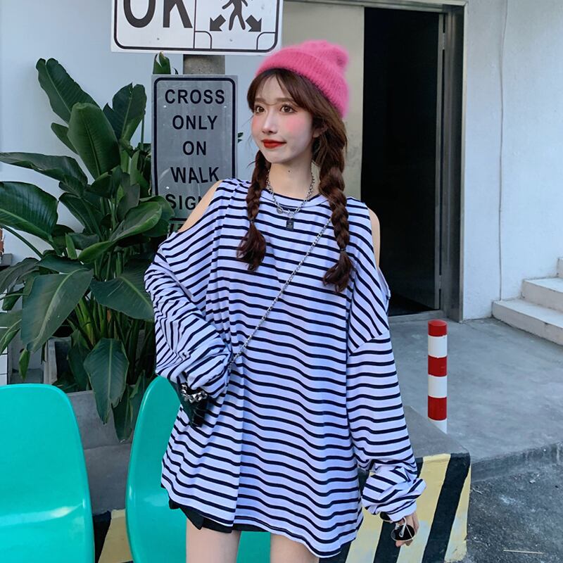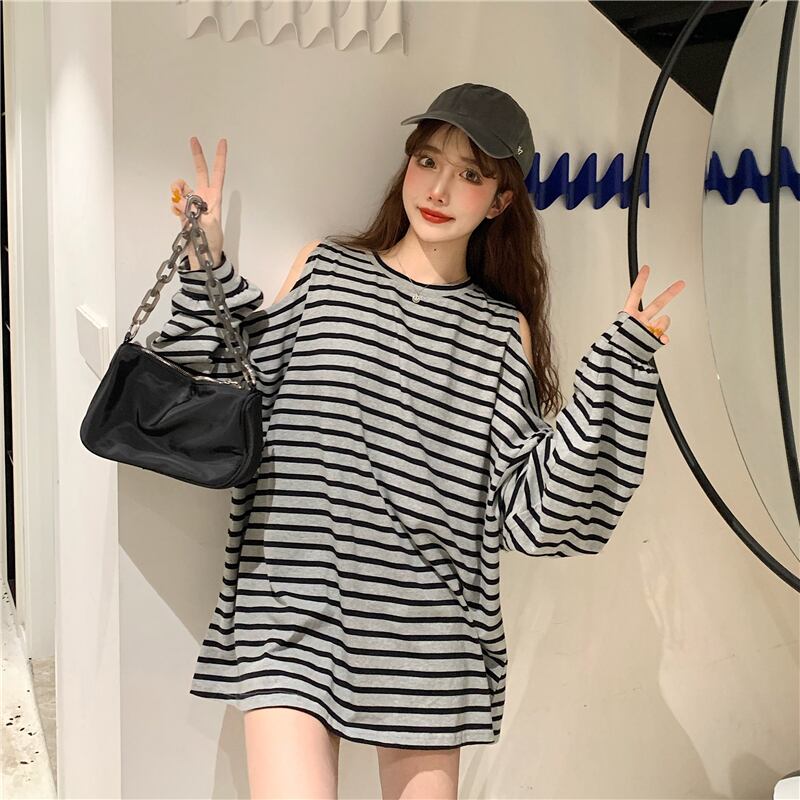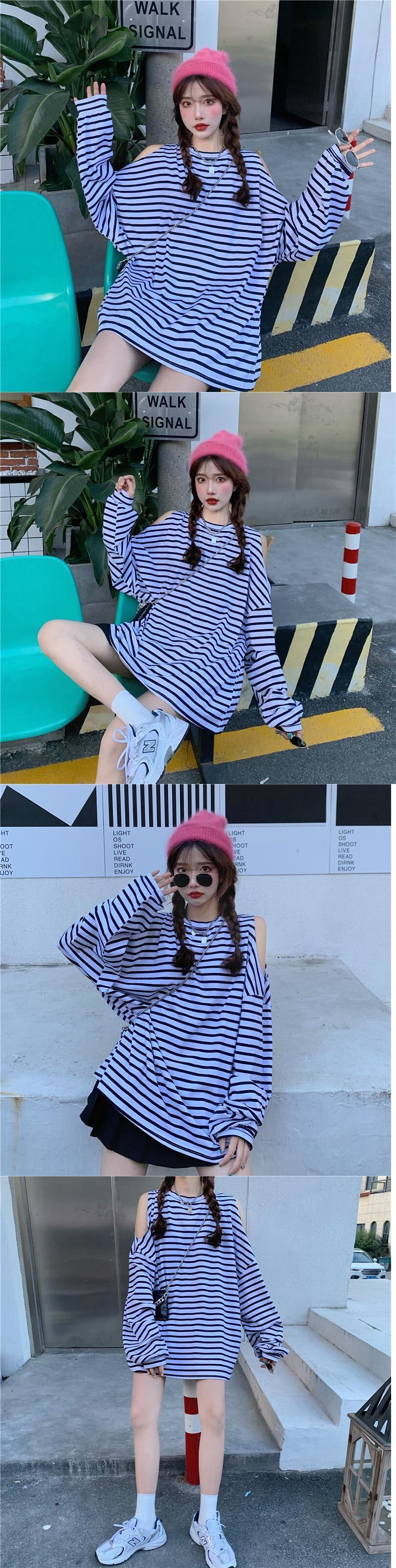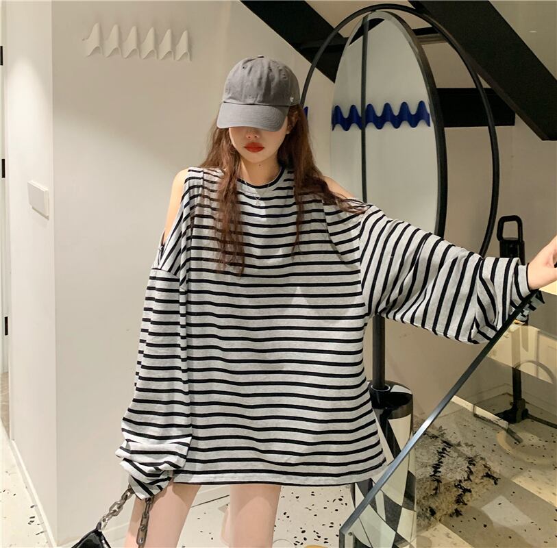 ストライプTシャツ スプリングオータムルーズトップス ロング レッド 春物 秋物 オフショルダー スーパーモール95142920971