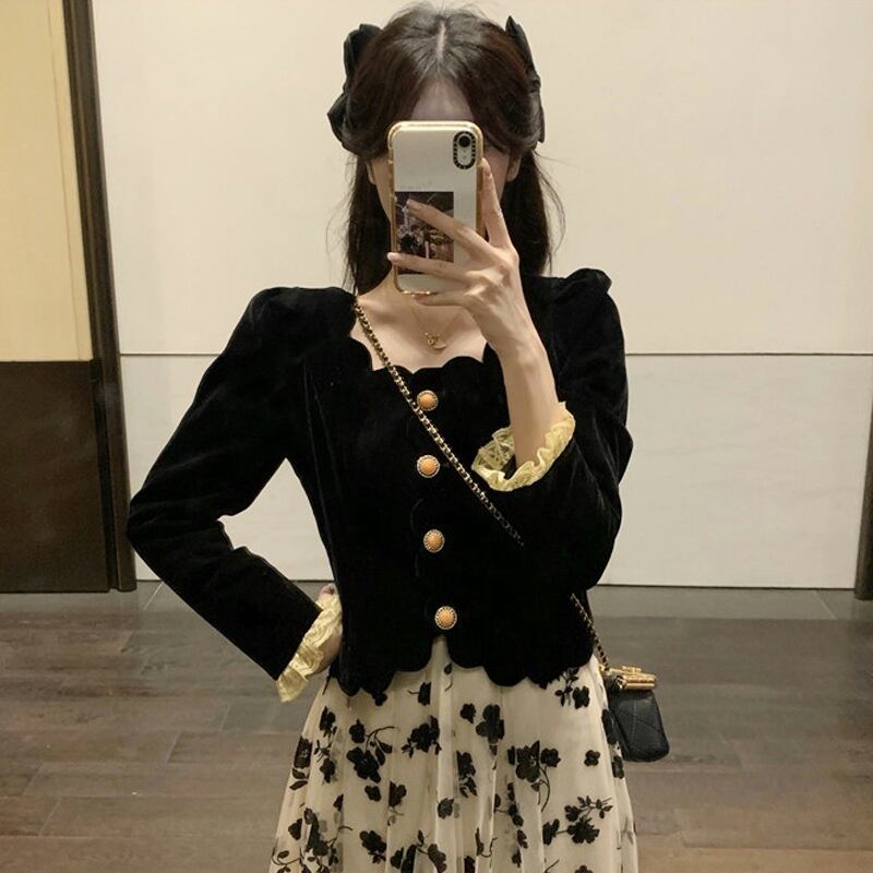 カラークロップトップ トップス スプリングオータムスタンダードブラックシャツ ロング レトロ 春物 秋物 スクウェア スーパーモール82637170352