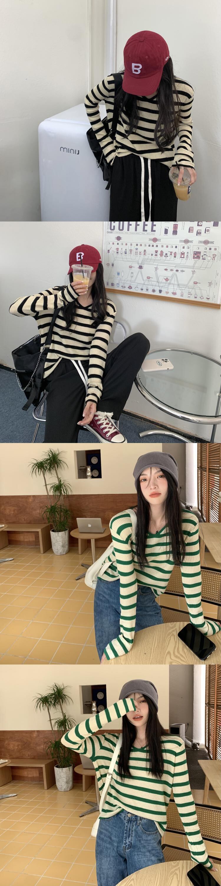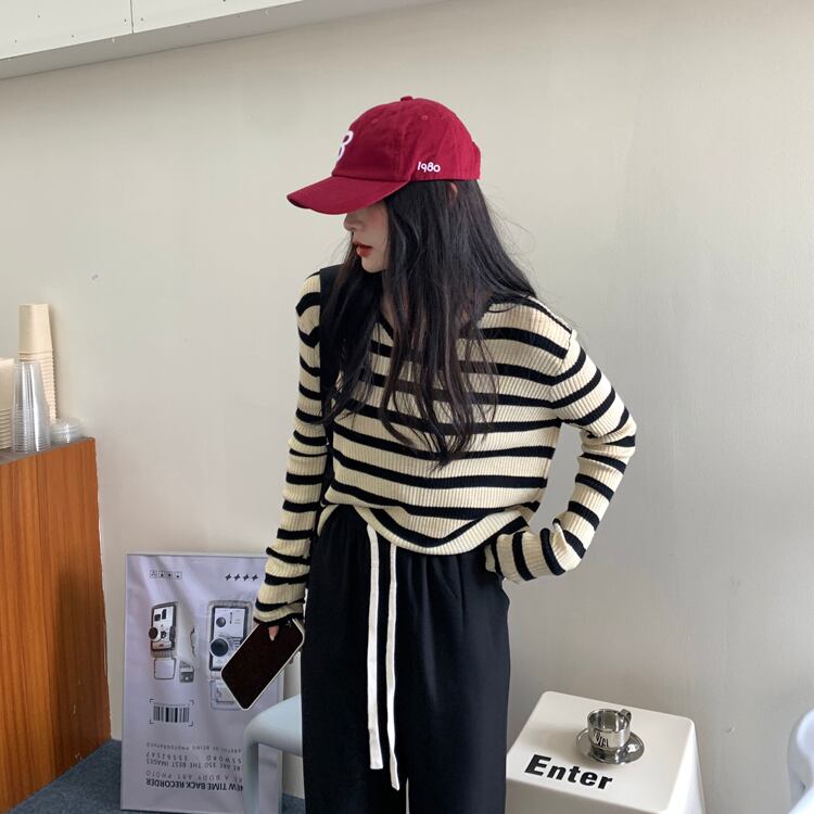 Vネックストライプセーター スプリングオータムウィンタースタイルシャツ トップス ロング 春物 秋物 冬物 スーパーモール16942327719
