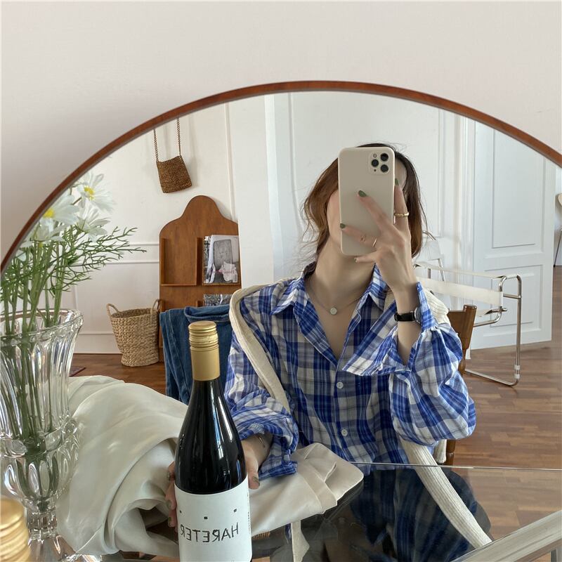 ブルー格子柄シャツ スプリングオータムトップス ロング 春物 秋物 スーパーモール58344763809