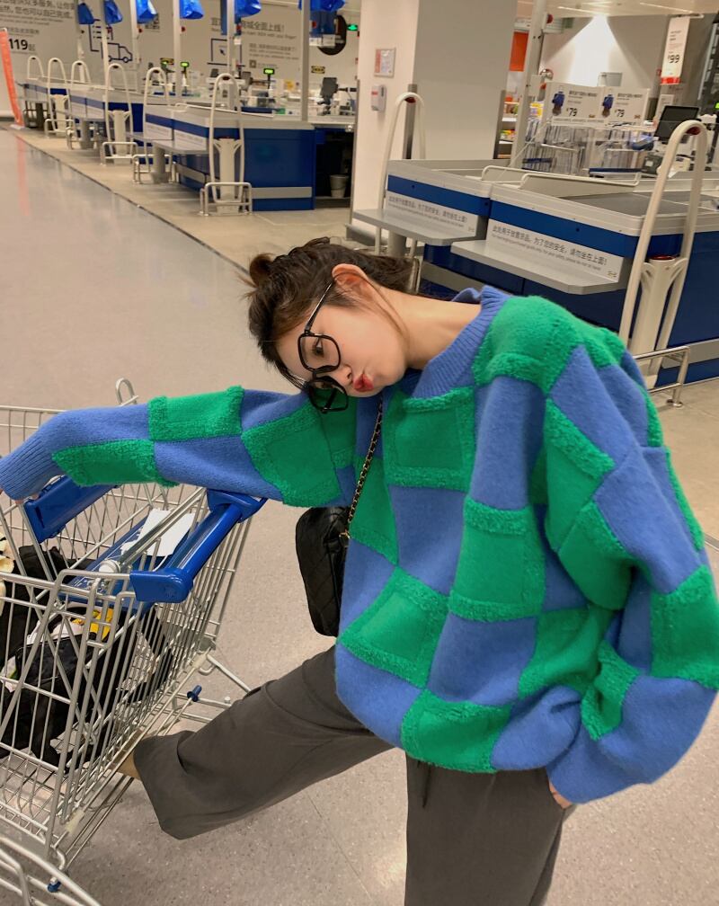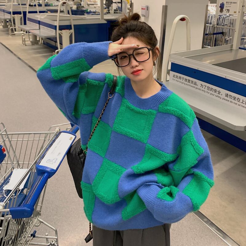 セーター スプリングオータムルーズ格子柄ニットトップス 春物 秋物 スーパーモール92486080699