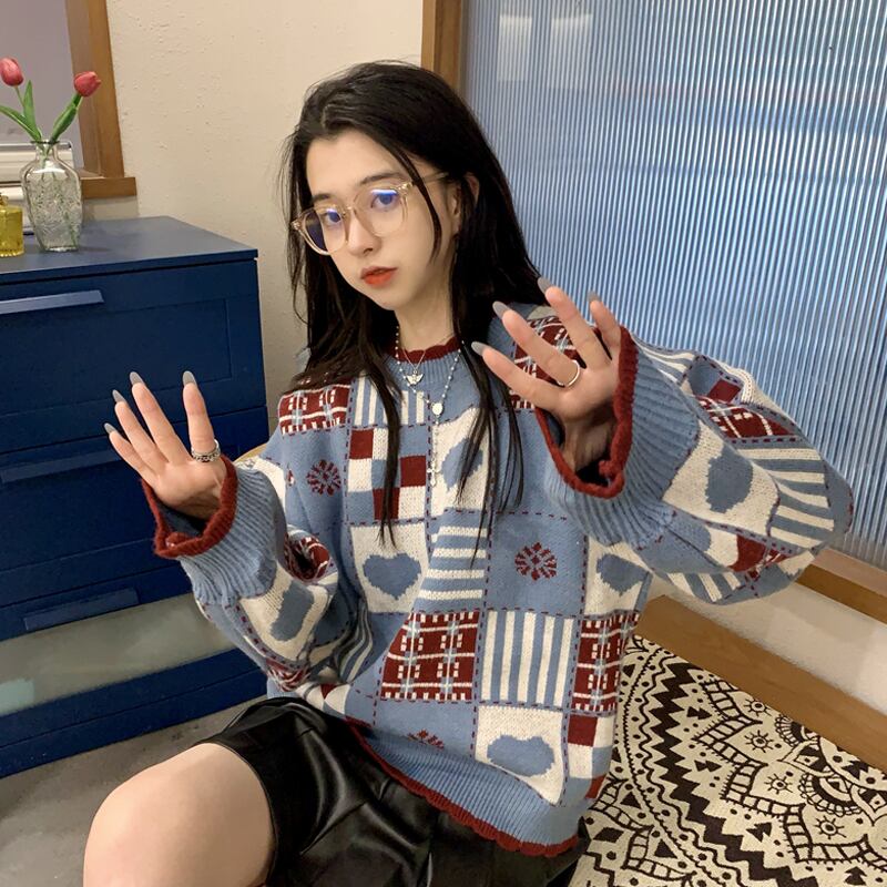 スタンダード格子柄セーター スプリングオータムルーズトップス レトロ 春物 秋物 スーパーモール19457965137